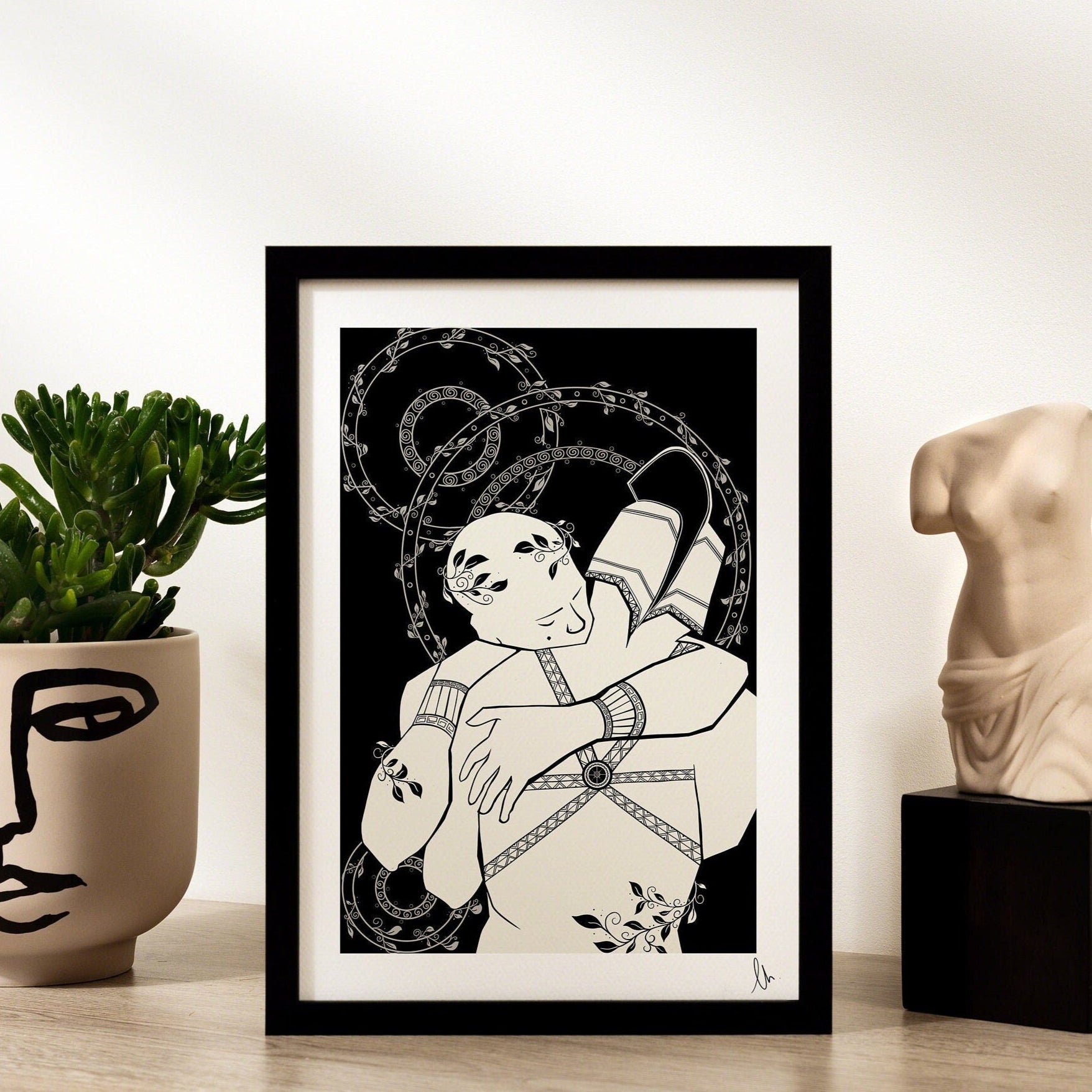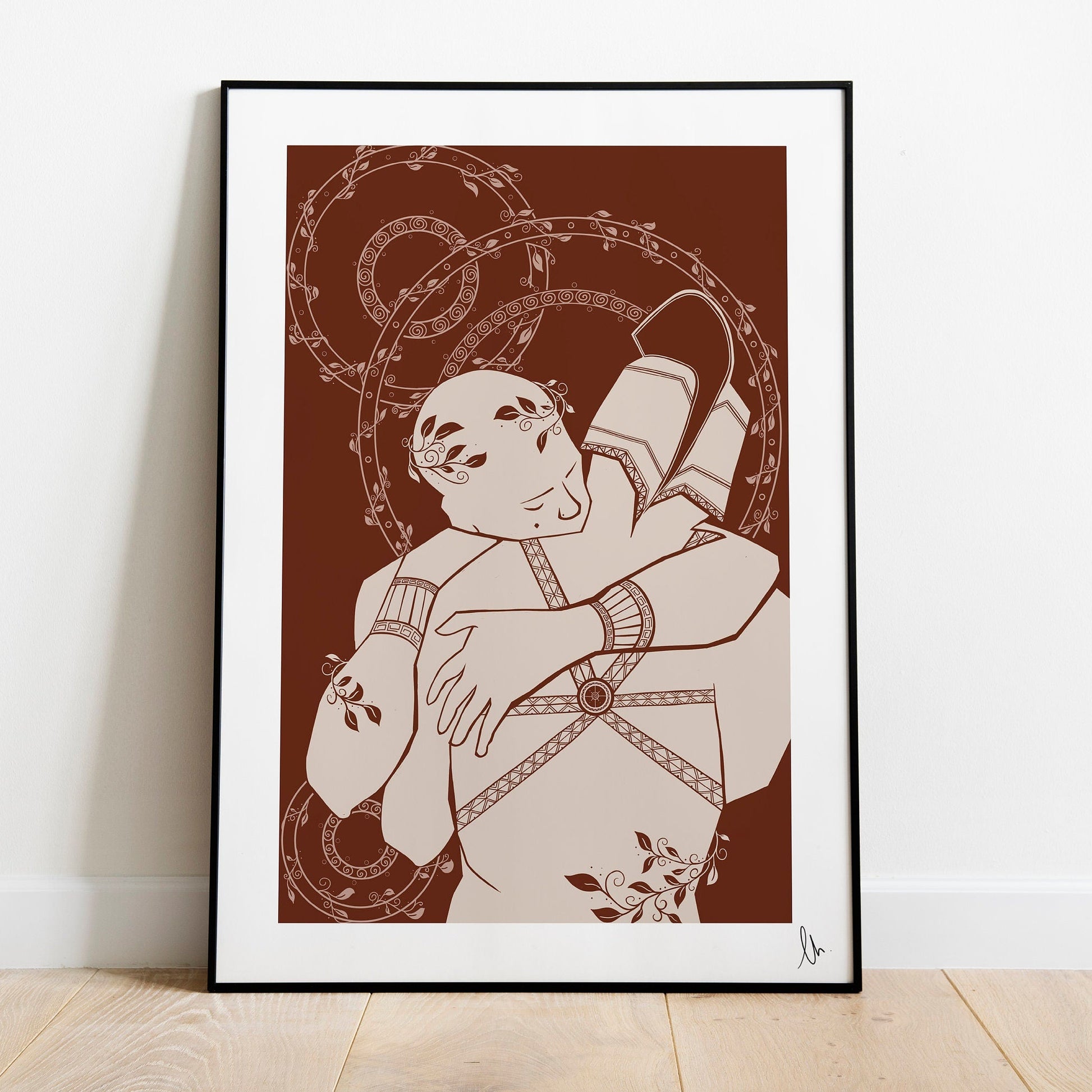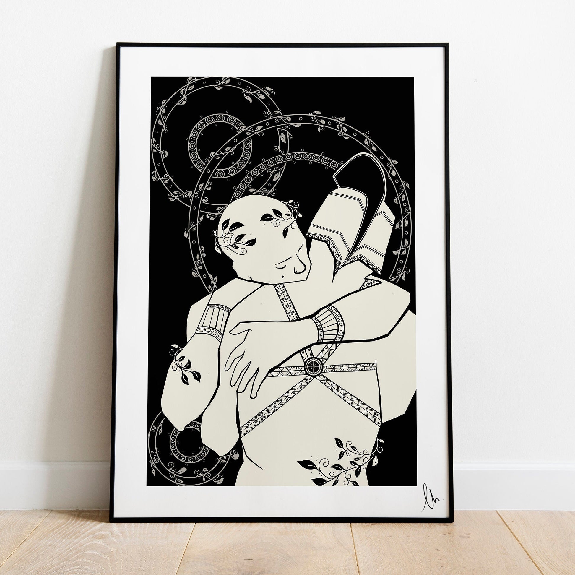 Part of the Greek Mythology collection interpreting classic tales of myths and legends, and reimagining in bold new ways. This print is inspired by the loving relationship between Achilles and Patroclus from The Song of Achilles and The Iliad. What started as a childhood friendship led to this beautiful romance between two star-crossed lovers.