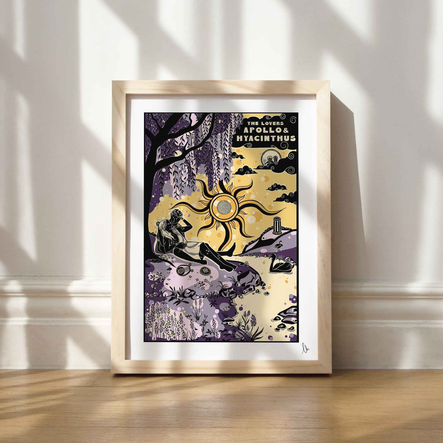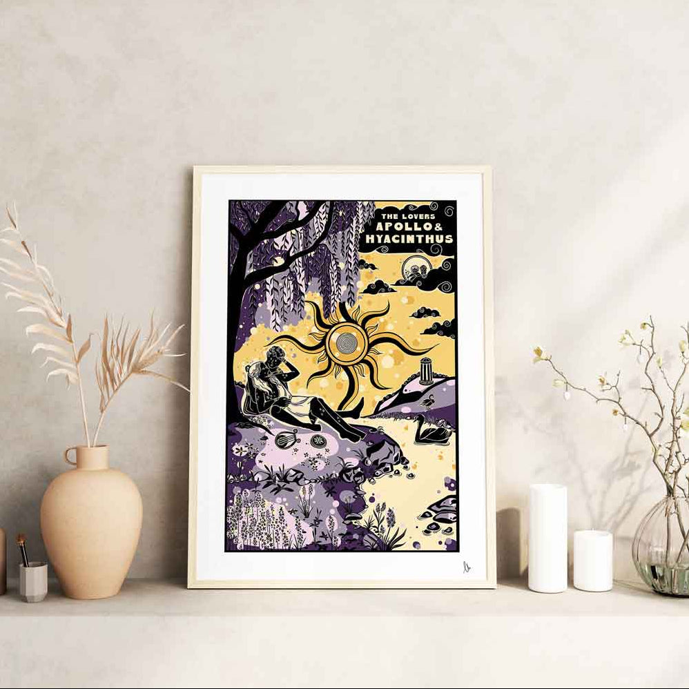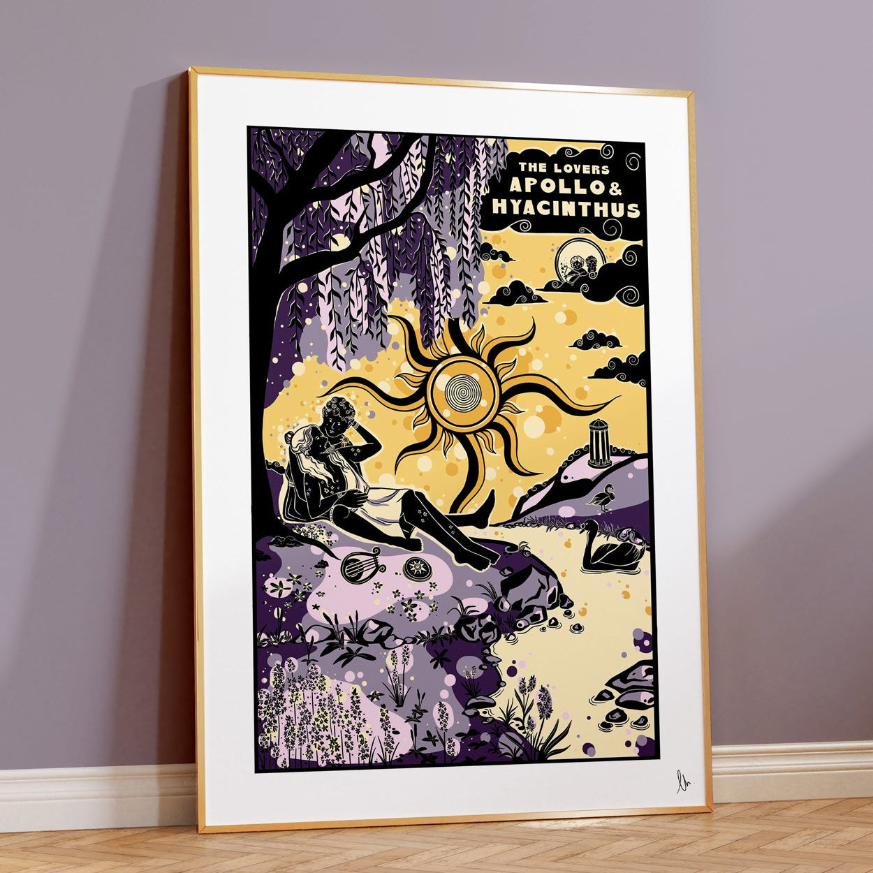 Celebrating the beautiful yet fated relationship of immortal Greek God of the Sun Apollo and the moral Hyacinthus. This is the perfect gift for of fan of Greek folklore or just an excellent way for a Mythology Lover to add some colour to their walls!