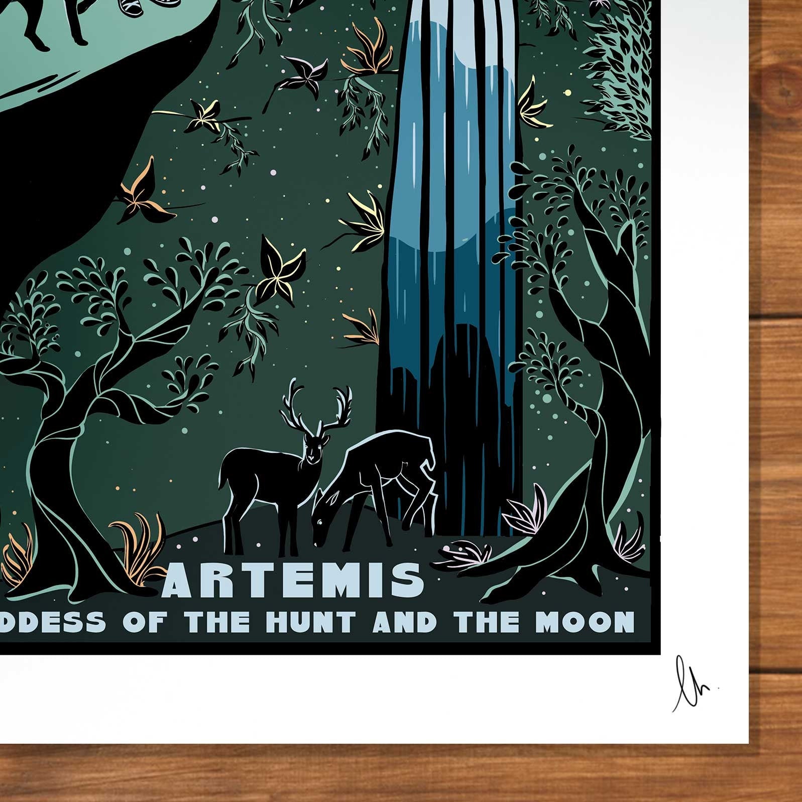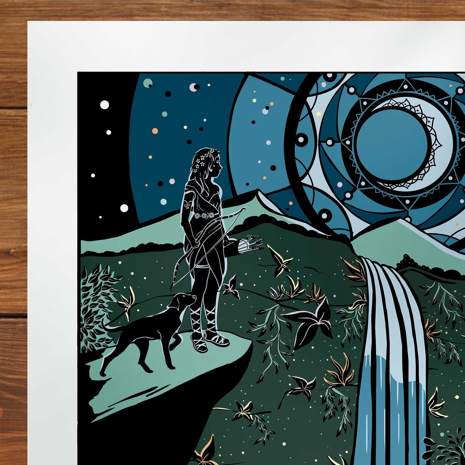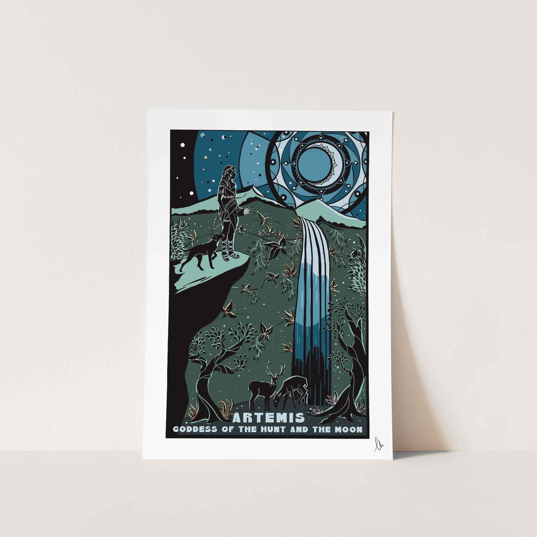 Celebrating the Greek Goddess Artemis, The Goddess of the Moon and the Hunt! Described as "she of the wild" and carrying her iconic bow and arrow, this print shows Artemis looking across the glowing, moonlit scenery. This is the perfect gift for of fan of Greek folklore or just an excellent way for a Mythology Lover to add some colour to their walls!