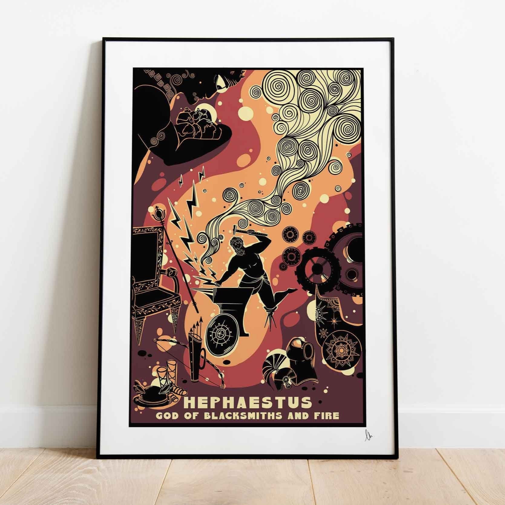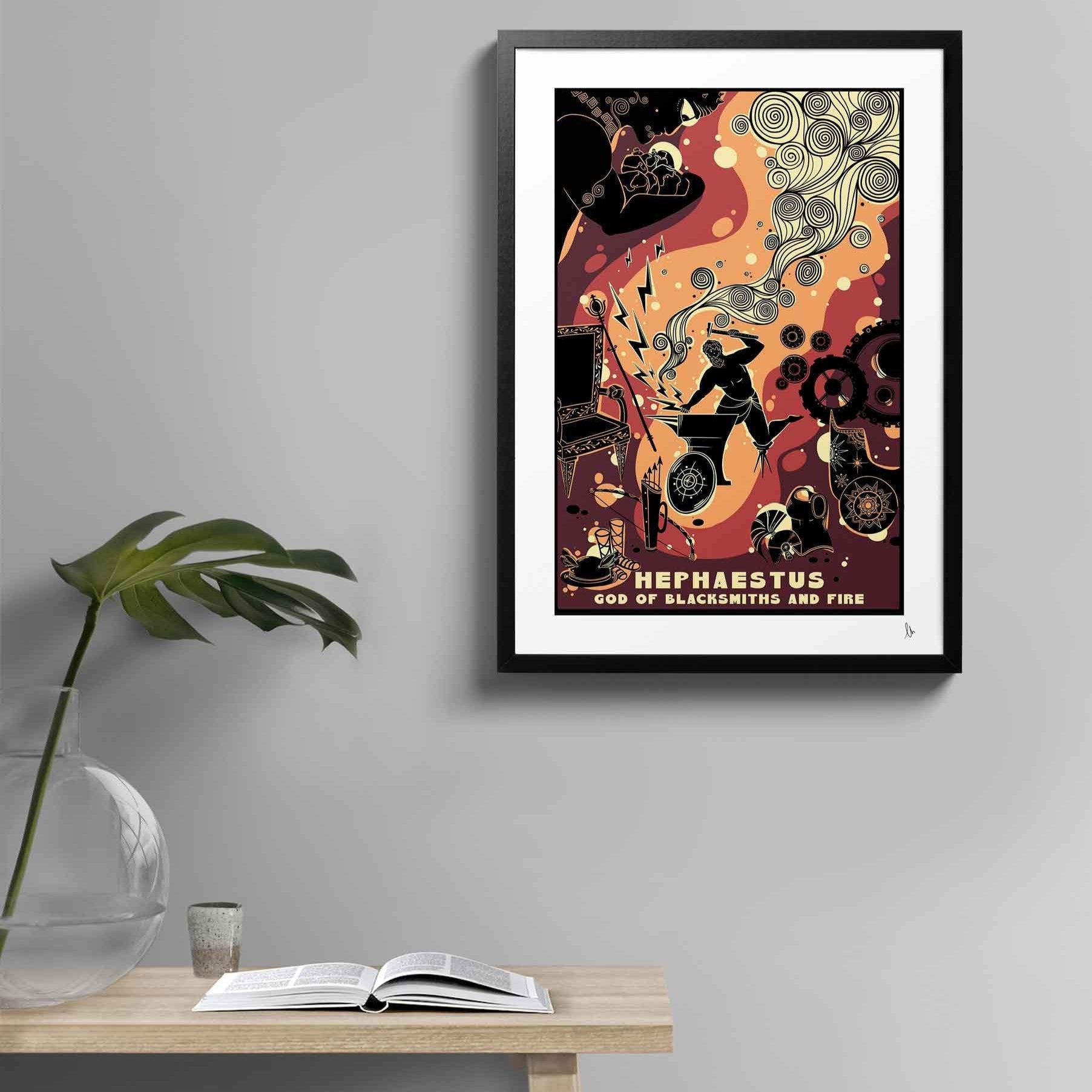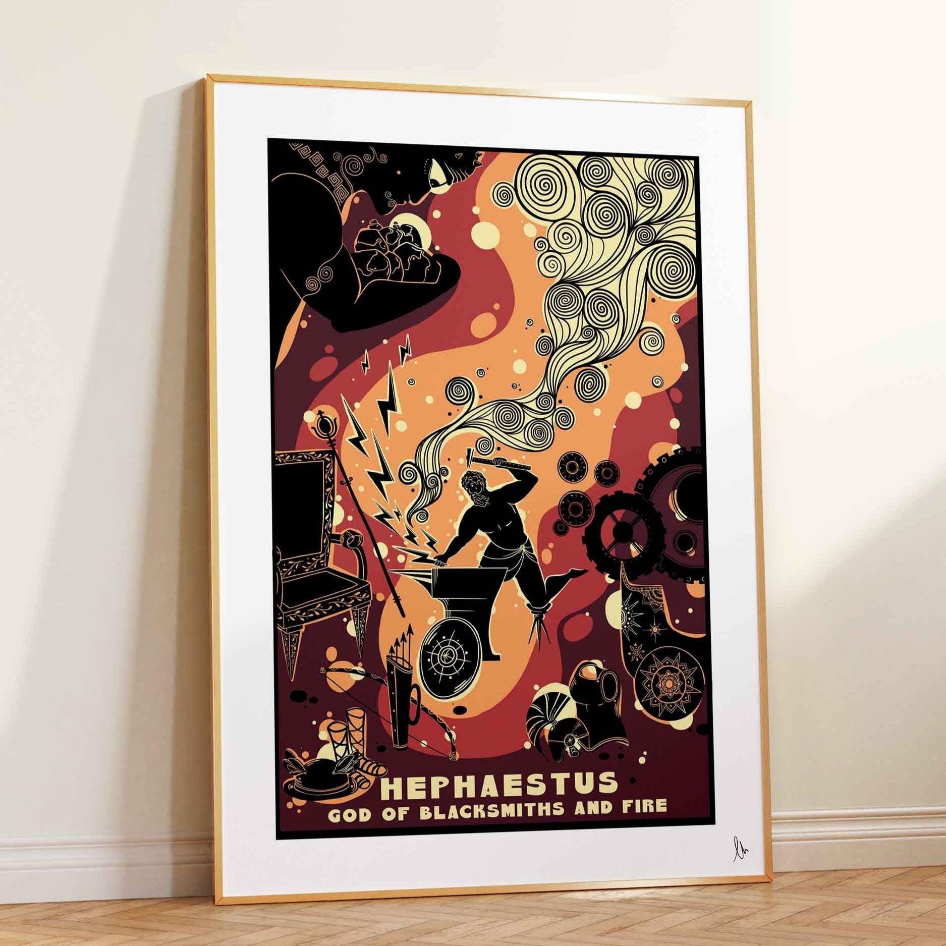 Hephaestus, the Greek God of Blacksmiths and Fire! Known for his remarkable craftsmanship and the creation of divine objects, this print showcases Hephaestus in his forge, surrounded by his masterpieces including the winged helmet of Hermes and Helios’ sun-pulling chariot. This is the perfect gift for a fan of Greek mythology, or a wonderful way for a mythology enthusiast to add some artistic flair to their walls!