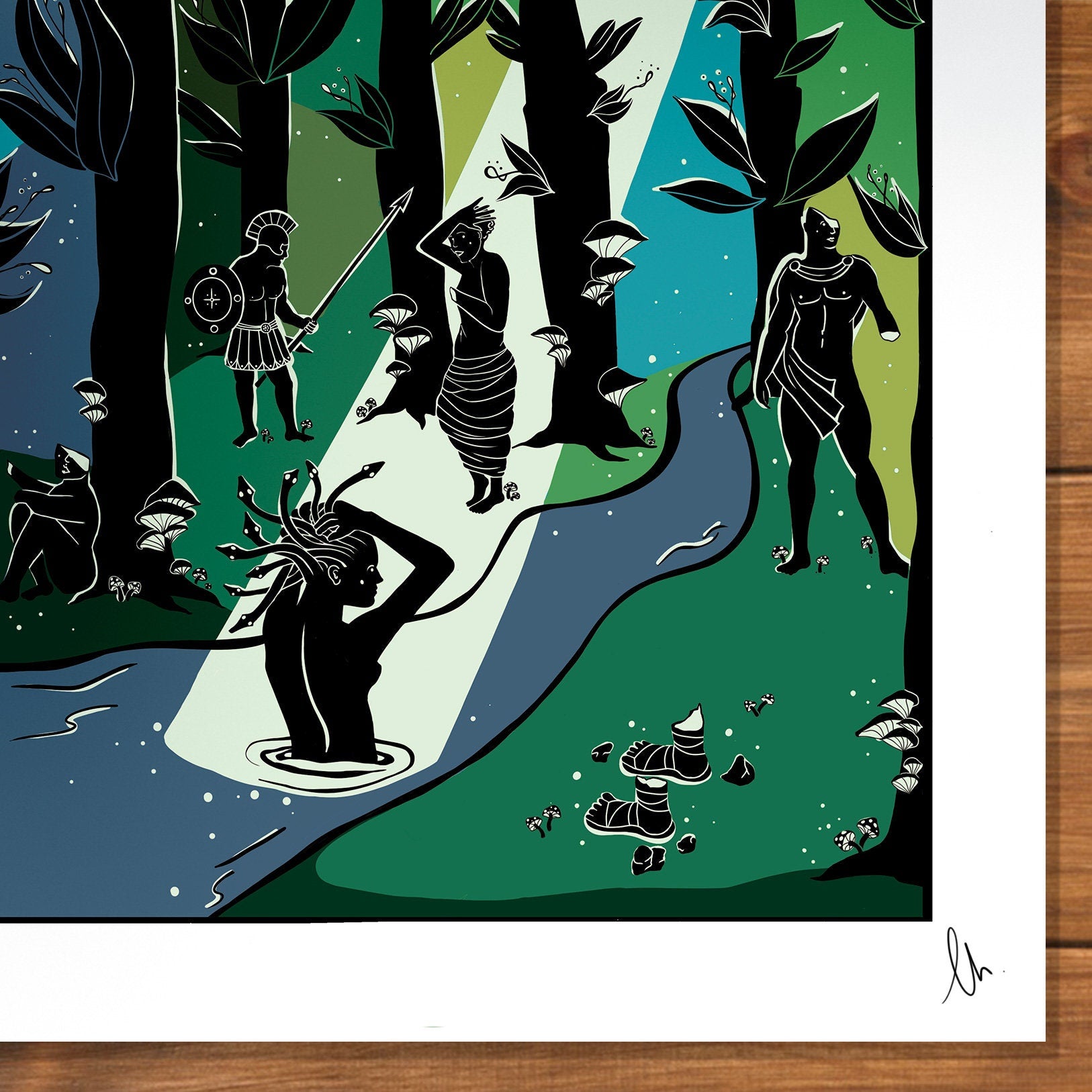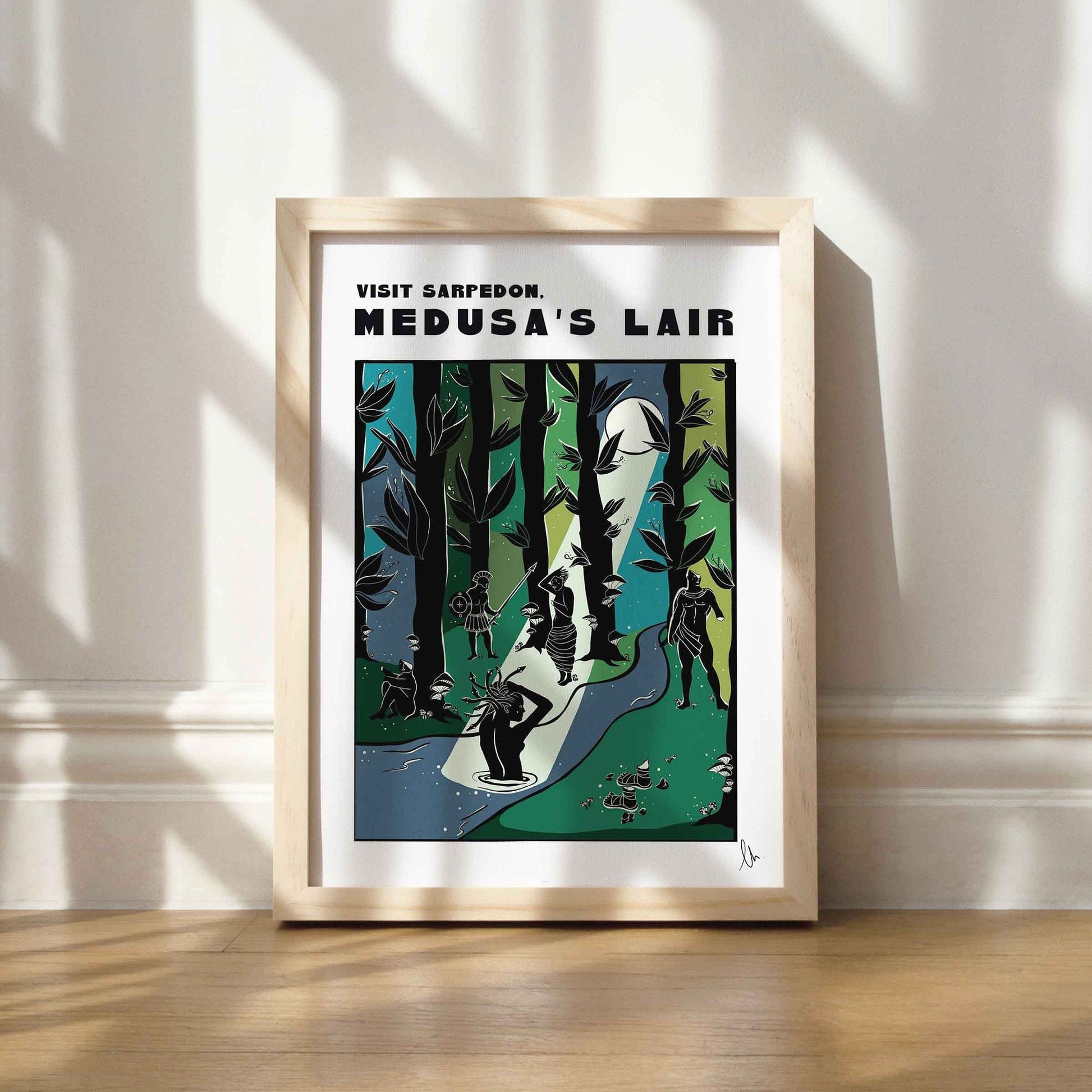 Visit the Island of Sarpedon, home to the exiled Medusa and her head of snakes, surrounded by beautiful jungle tropics and sinisterly realistic statues! Just be sure not to look her in the eye! Perfect for fans of greek mythology and fantasy landscapes, this minimal retro-style travel poster could liven up your study, or bedroom!