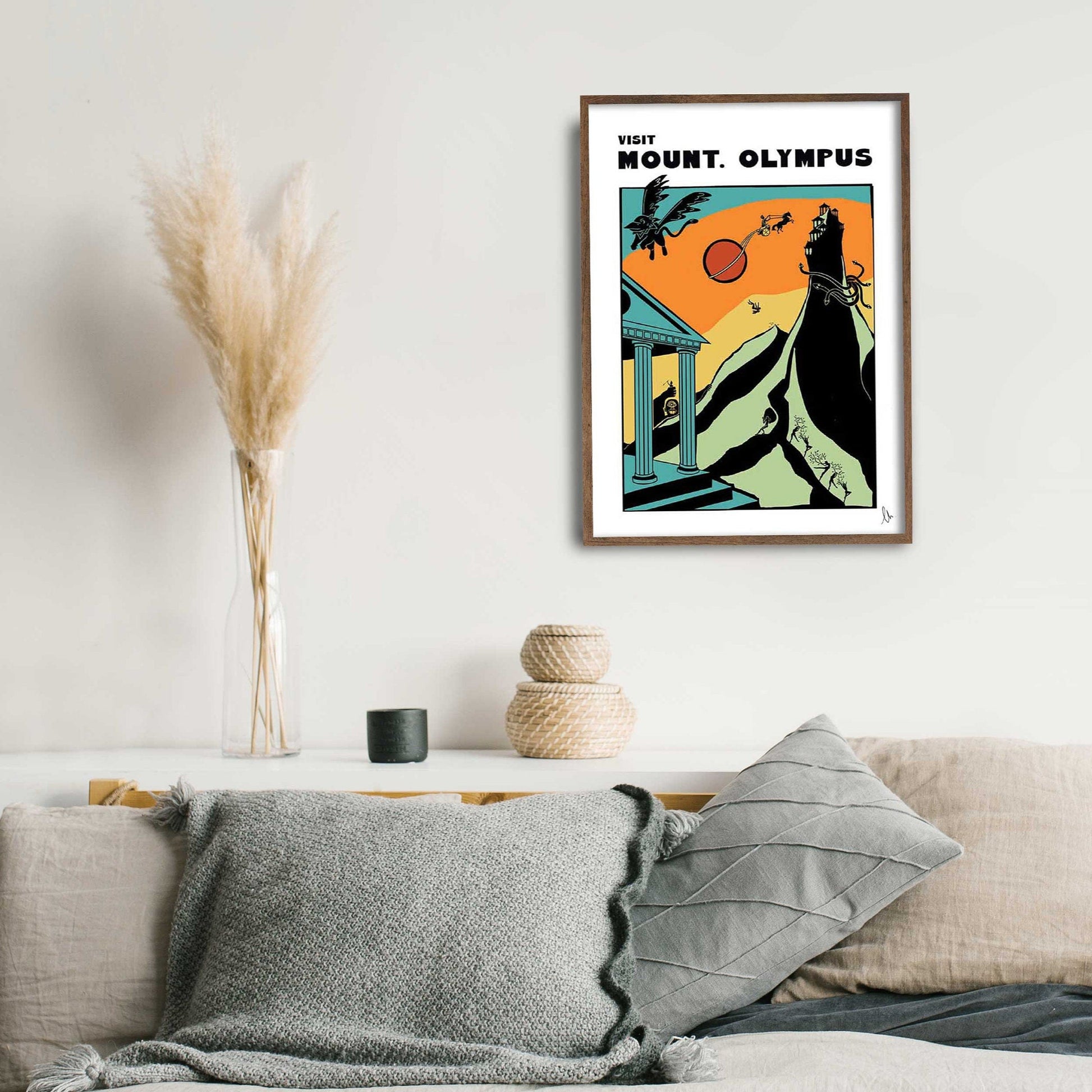 Visit Mount. Olympus, the untouchable kingdom in the sky, home to the ancient Gods and Goddesses. Perfect for fans of greek mythology and fantasy landscapes, this minimal retro-style travel poster could liven up your study, or bedroom!