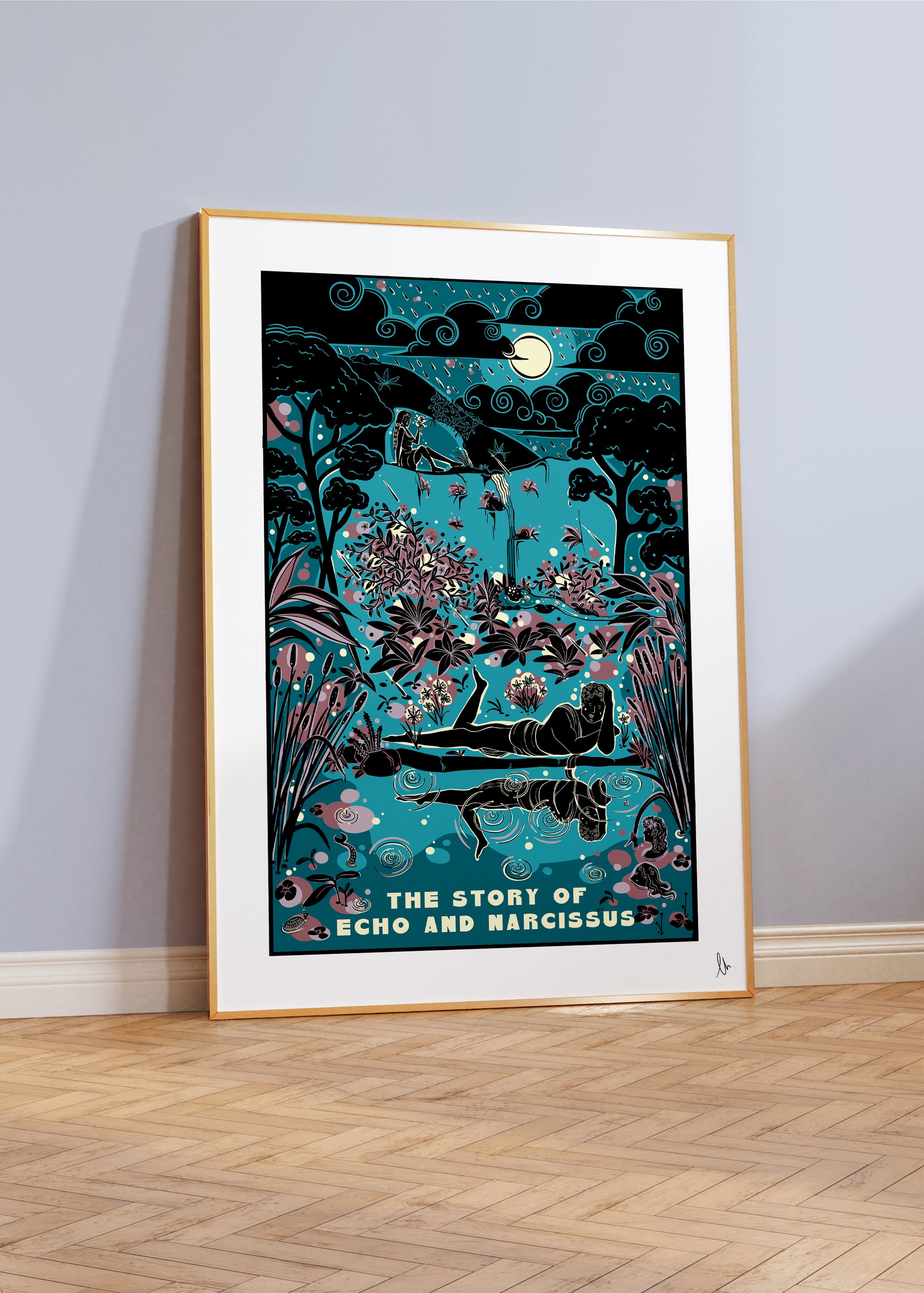 Introducing the tale of unrequited love between a nymph forced only to repeat the last words said to her, and a man who fell in love with his own reflection. This is the perfect gift for a fan of Greek mythology, or a wonderful way for a mythology enthusiast to bring a touch of homey comfort to their walls!