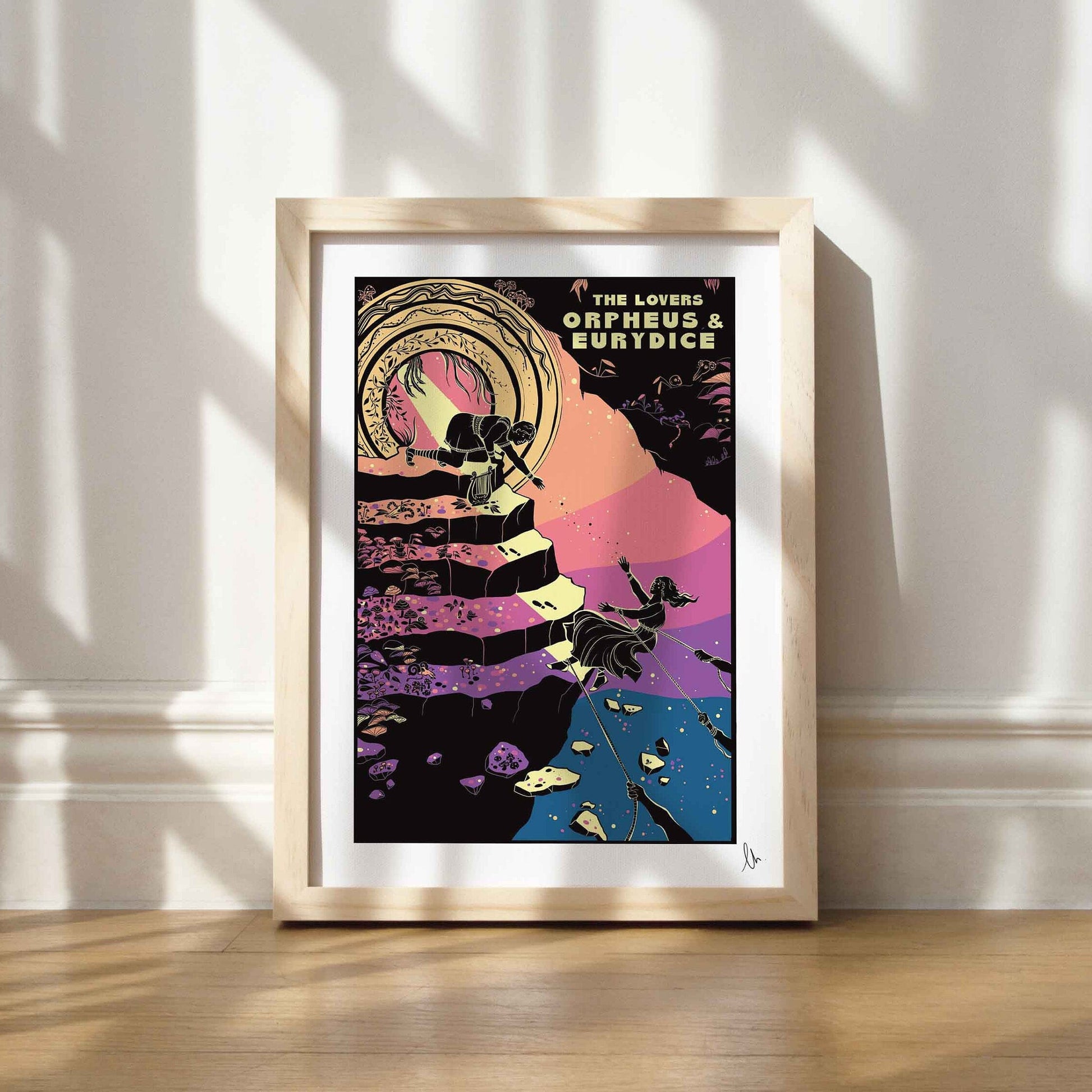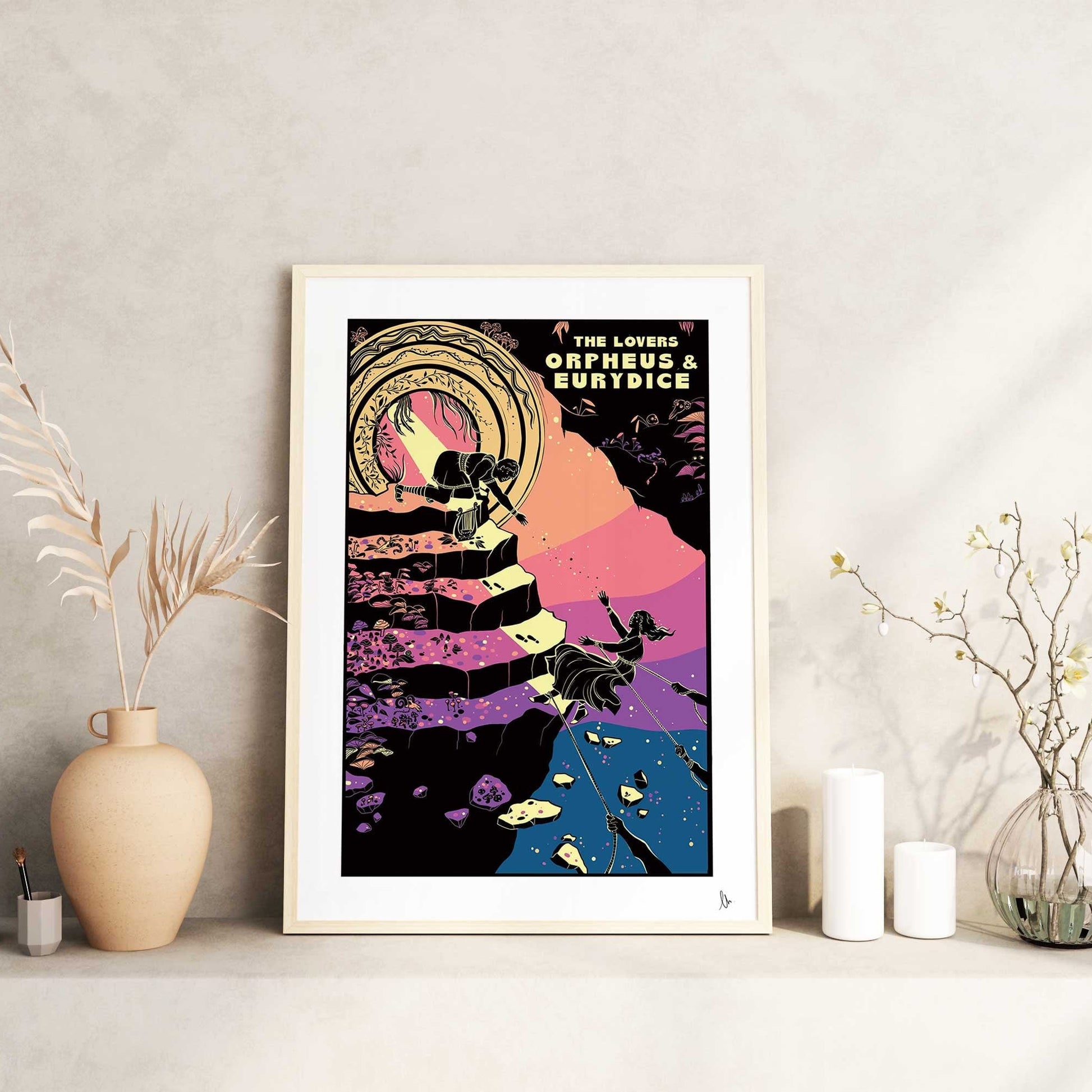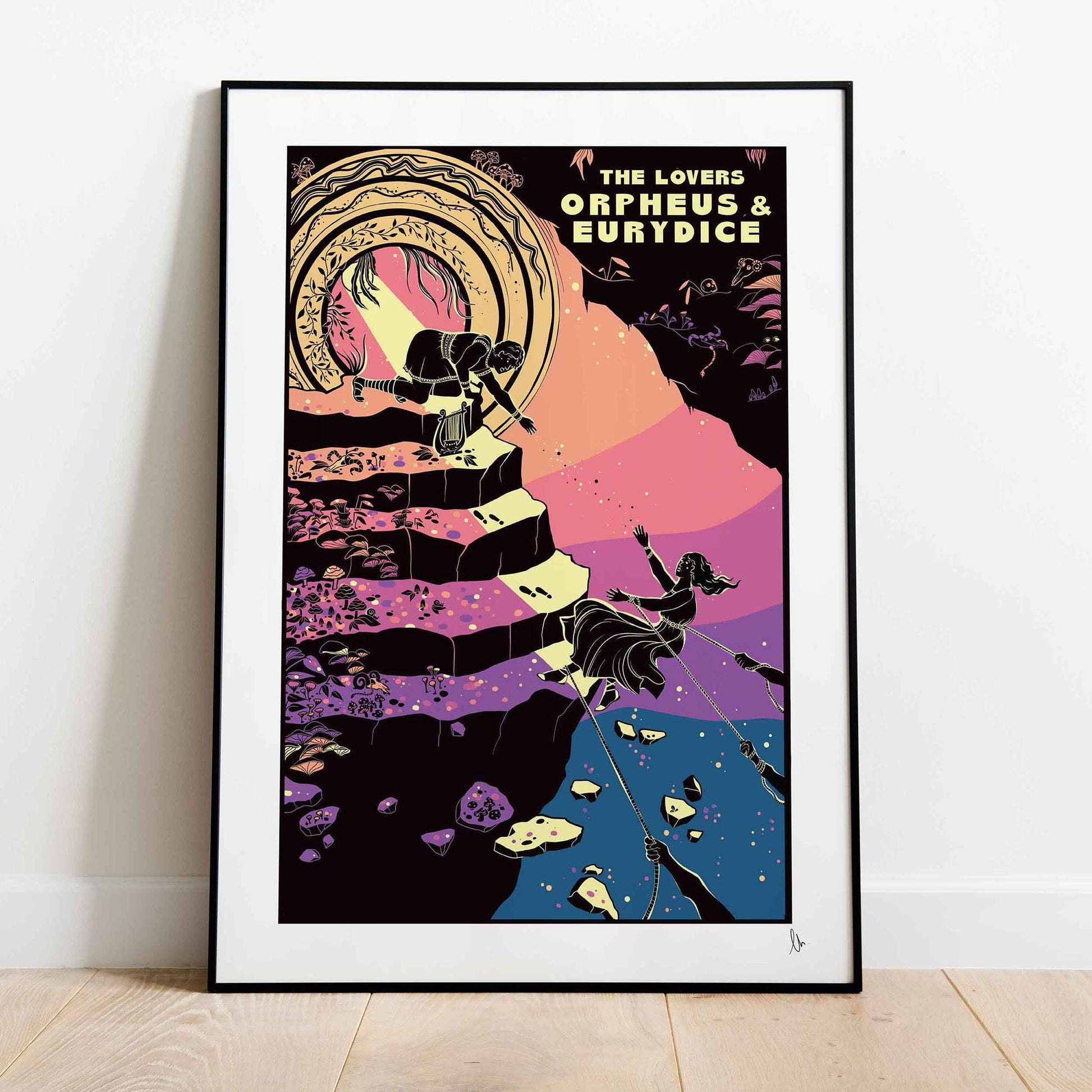 A print dedicated to one of the most beautiful and tragic Greek Myth love stories. Orpheus went to the Underworld to rescue his lover. He used his music to persuade Hades to release her, but Hades made Orpheus promise not to look back at her until they were both out. In the end, Orpheus looked back and his lover was dragged back to the Underworld. This is the perfect gift for a fan of Greek folklore or just an excellent way for a Mythology Lover to add colour to their walls!