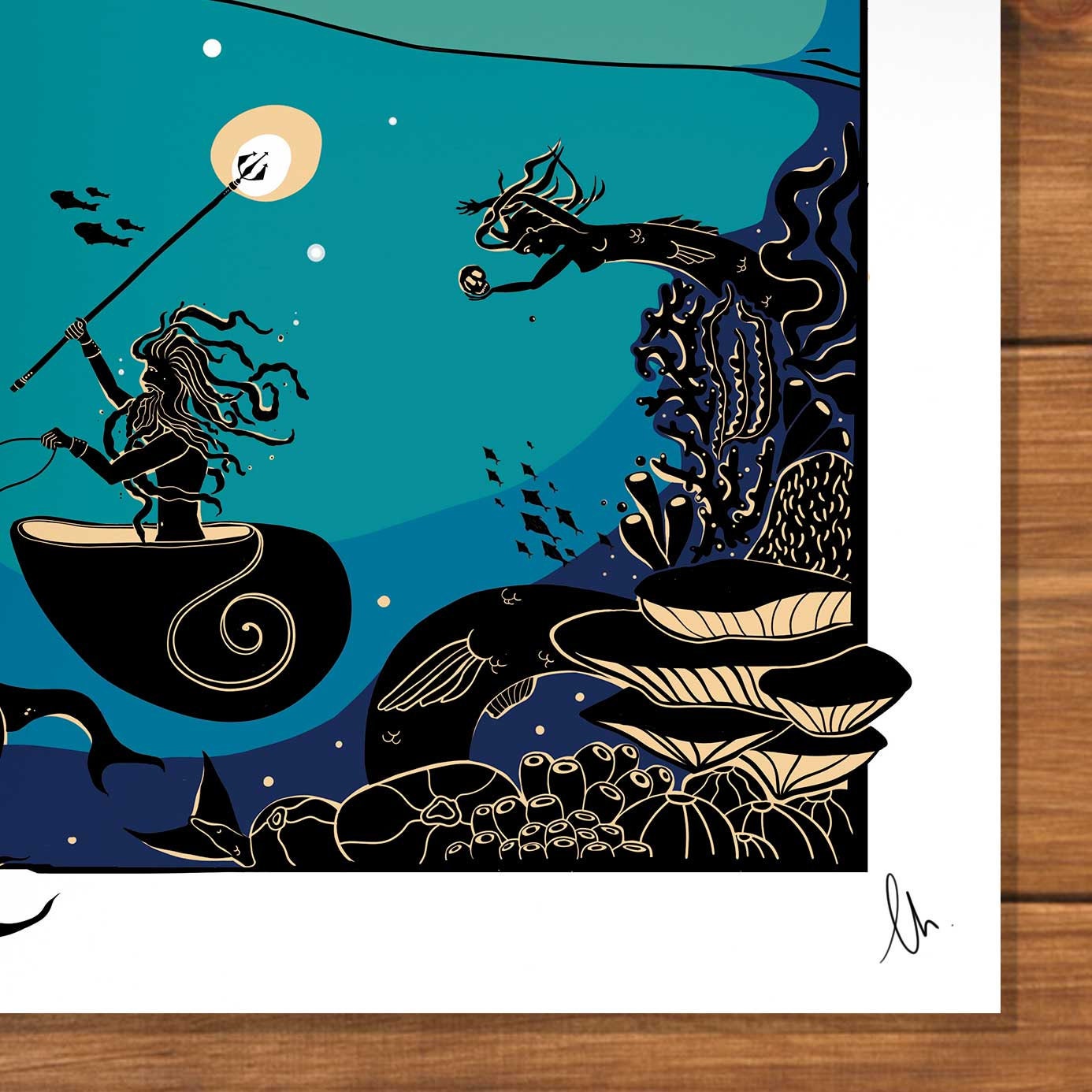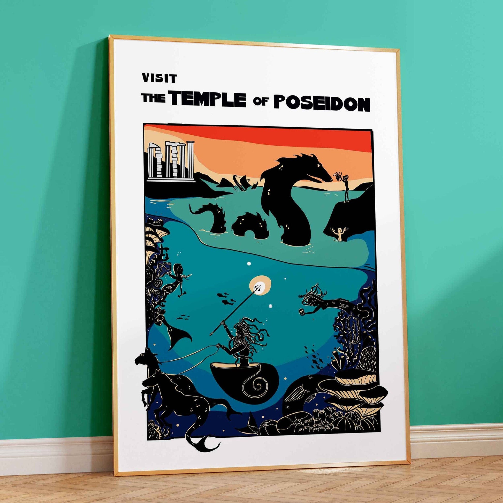 Visit The Temple of Poseidon, a place to celebrate the God of the Sea and all the weird and wonderful creatures lurking beneath the surface. Whether it be a Siren luring ships to the rocks, a quite literal sea horse galloping under the shores, or the terrifying Cetus, you'll want Poseidon on your side when crossing the sea. Perfect for fans of greek mythology and fantasy landscapes, this retro-style travel poster could liven up your study, or bedroom!