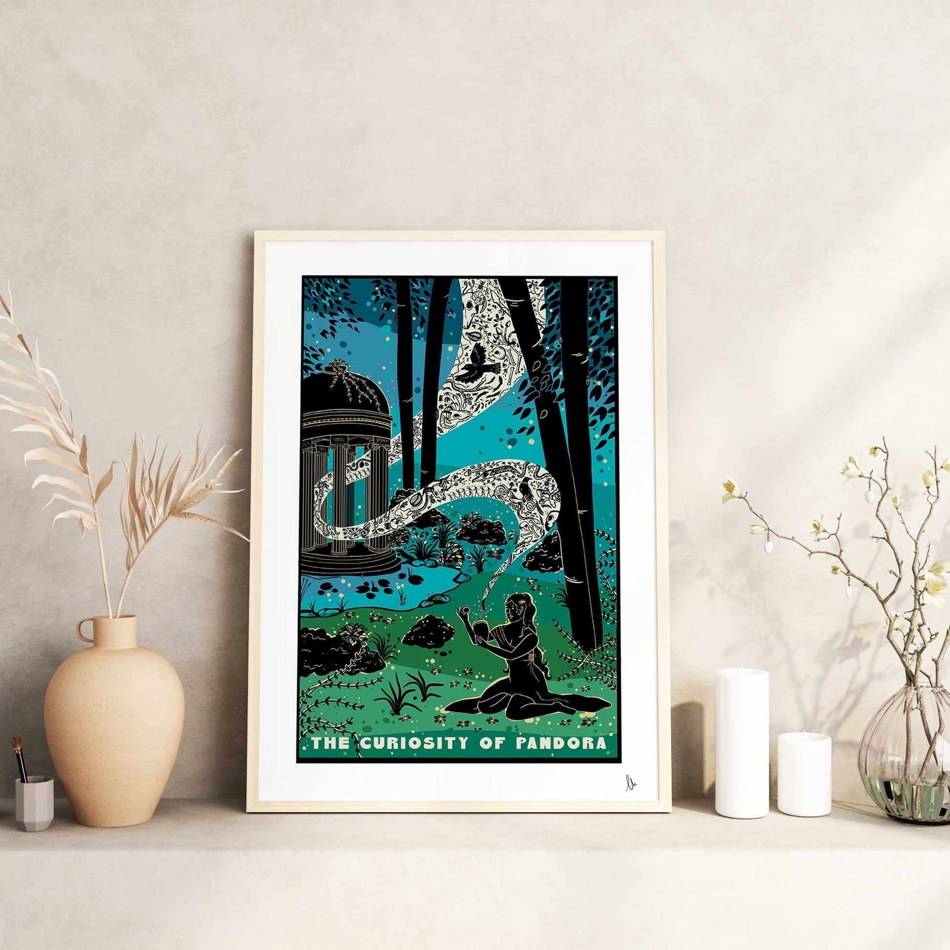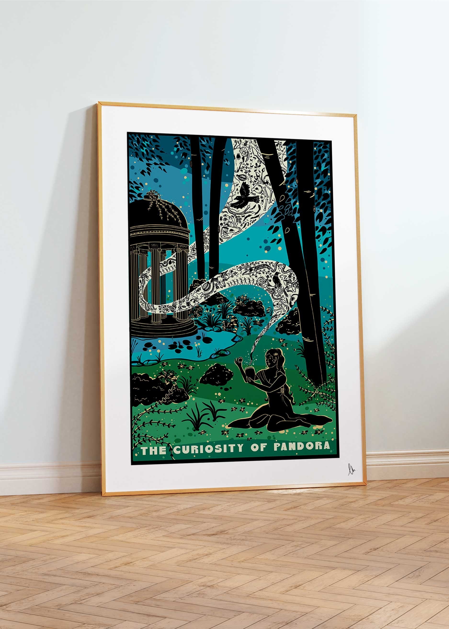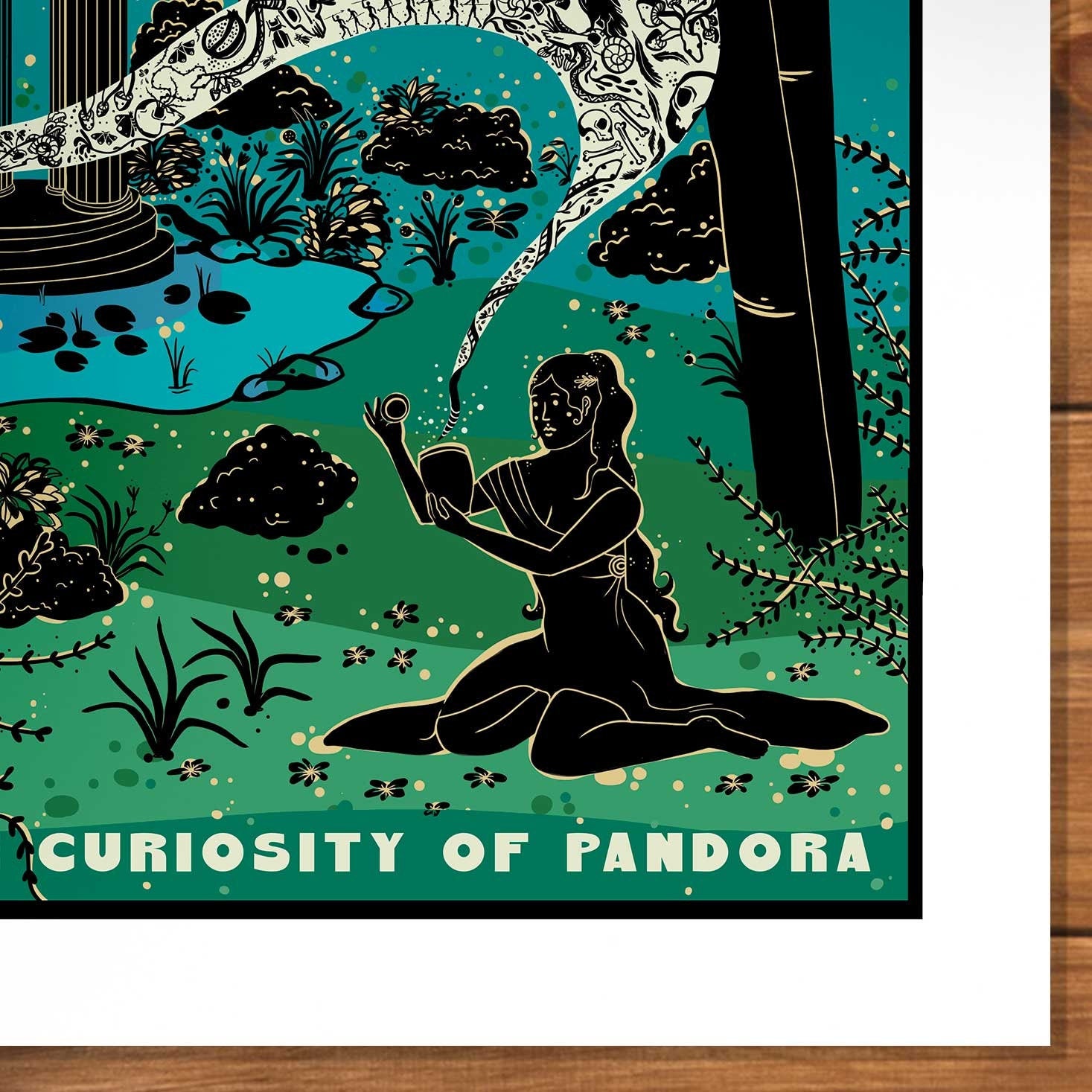 The Curiosity of Pandora, the first human who couldn't resist looking in the forbidden box and unleashed sin and death into the world. This is the perfect gift for of fan of Greek folklore or just an excellent way for a Mythology Lover to add some colour to their walls!