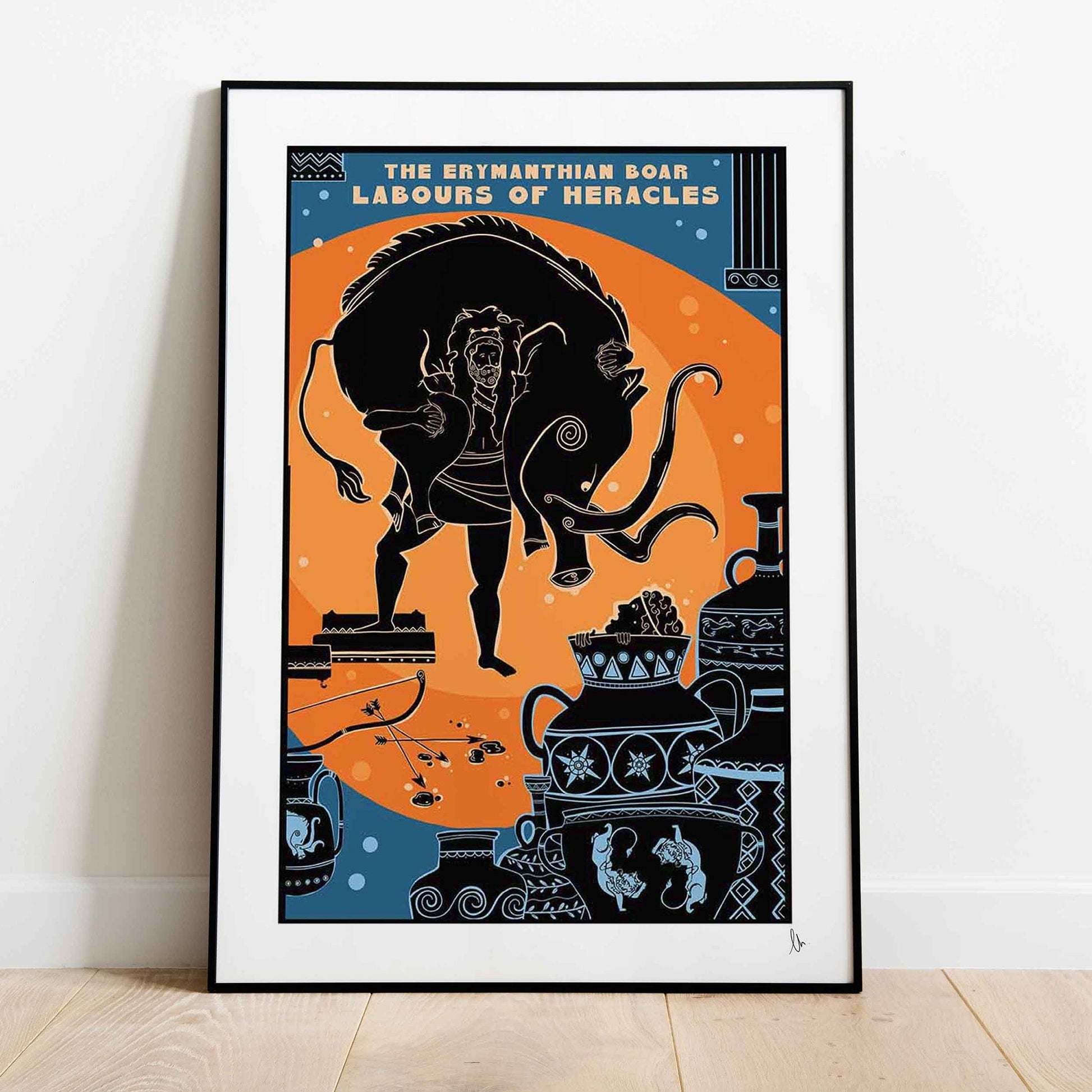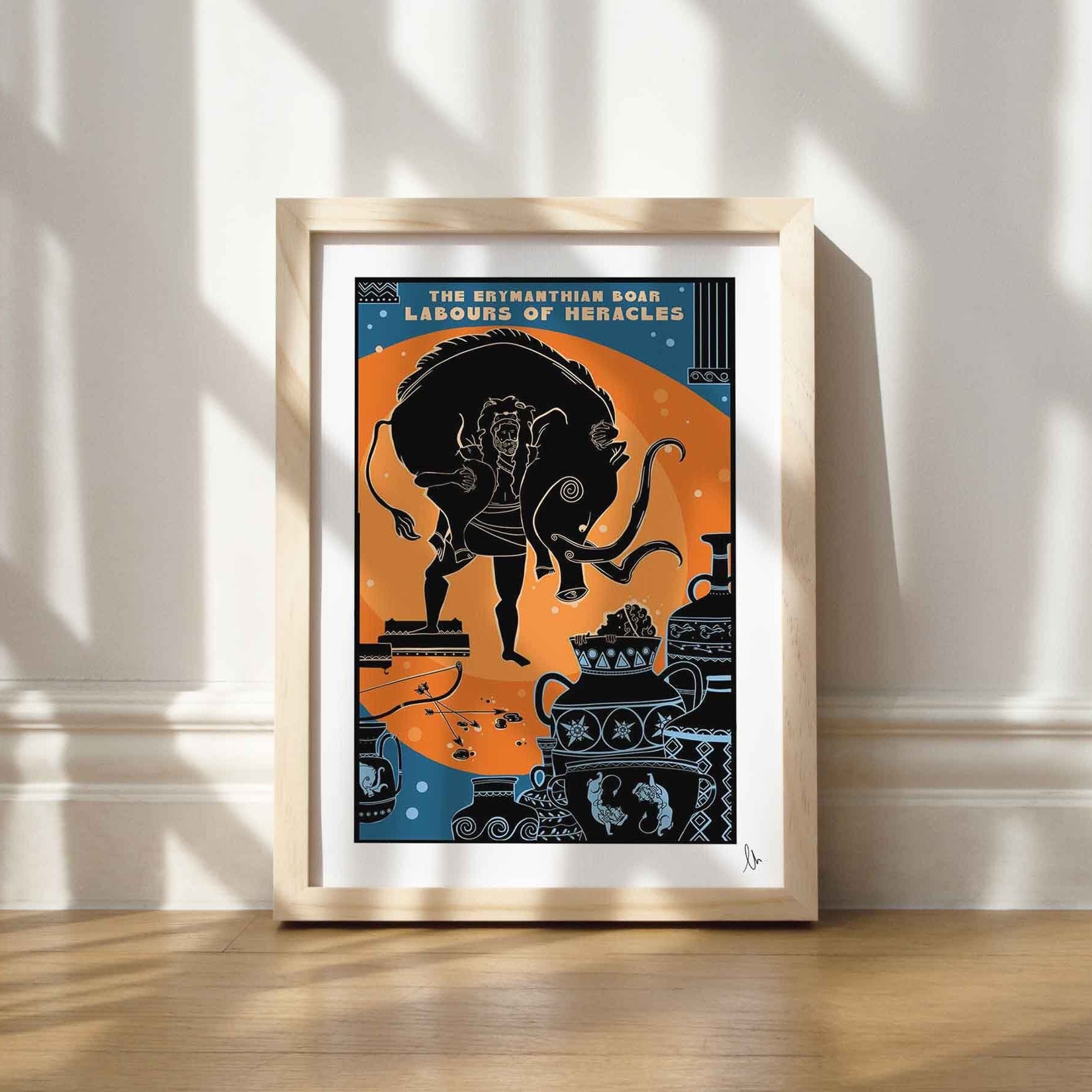 4/12: The fourth of the 12 Labours of Heracles shows him capturing the Erymanthian Boar. This huge beast was so terrifying to caused the king to hide in a jar! Celebrate Heracles' resilience, incredible strength, and captivating journey through this series of prints, as he takes on the challenges of the Ancient Greek world of mythology.