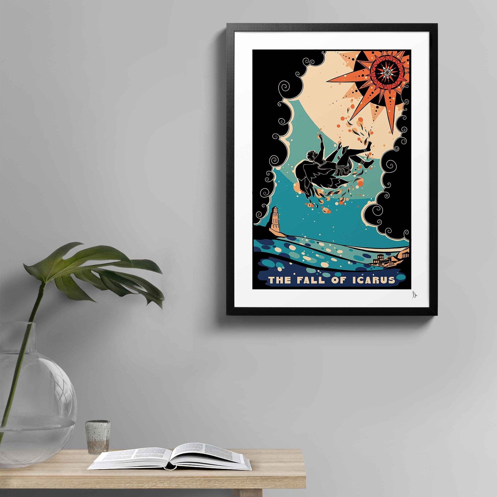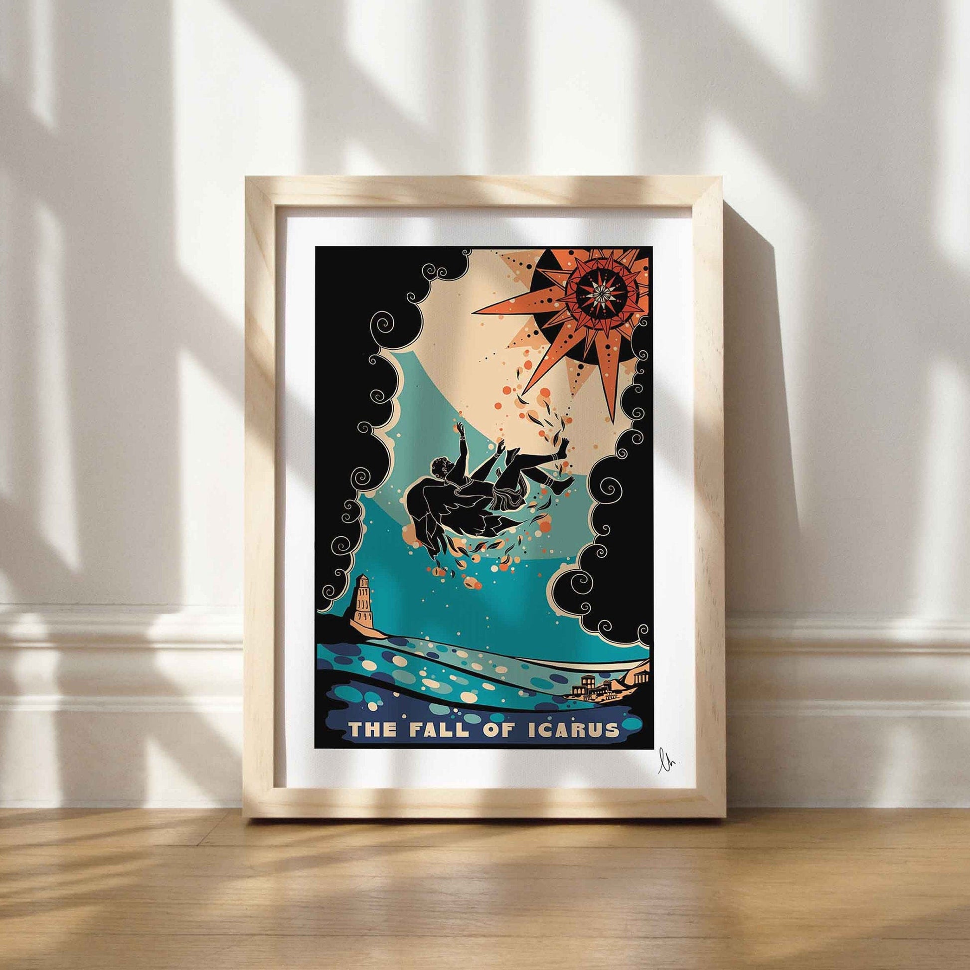 Bold and bright wall art dedicated to Greek Mythology's Icarus, who famously flew too close to the sun. This is the perfect gift for of fan of Greek folklore or just an excellent way for a Mythology Lover to add some colour to their walls!