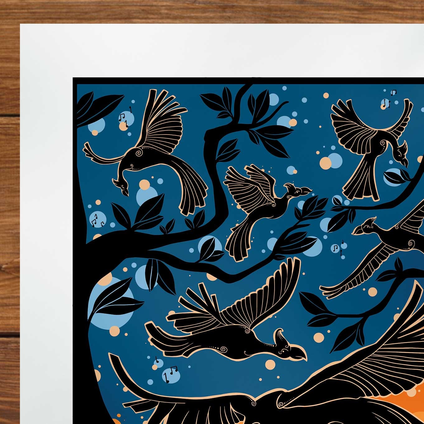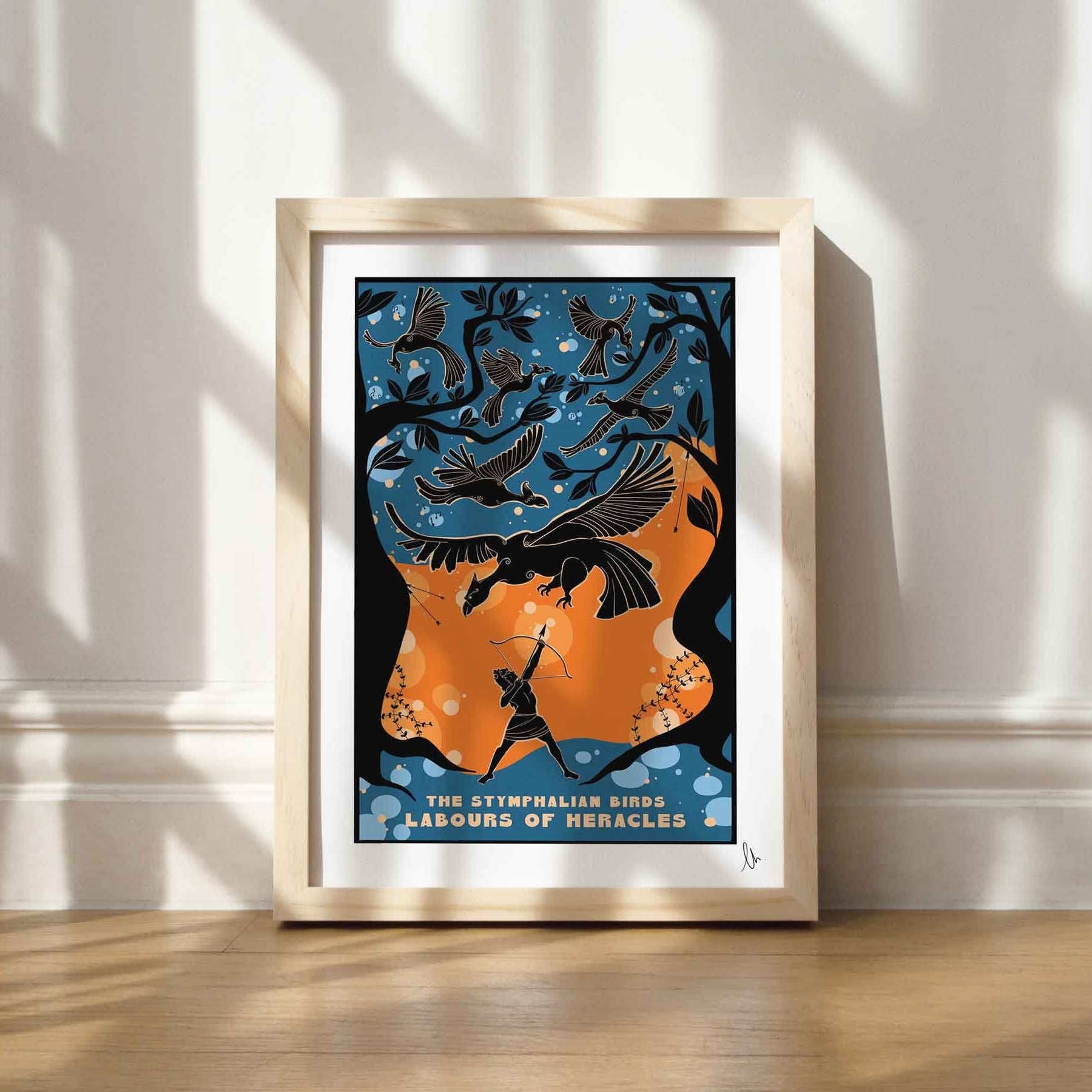 6/12: The sixth of the 12 Labours of Heracles: slaying the Stymphalian birds! These angry man-eating birds were terrorising a forest in Arcadia. Using a rattle given to him by Athena, Heracles scared them and then shot them down as they flew away.