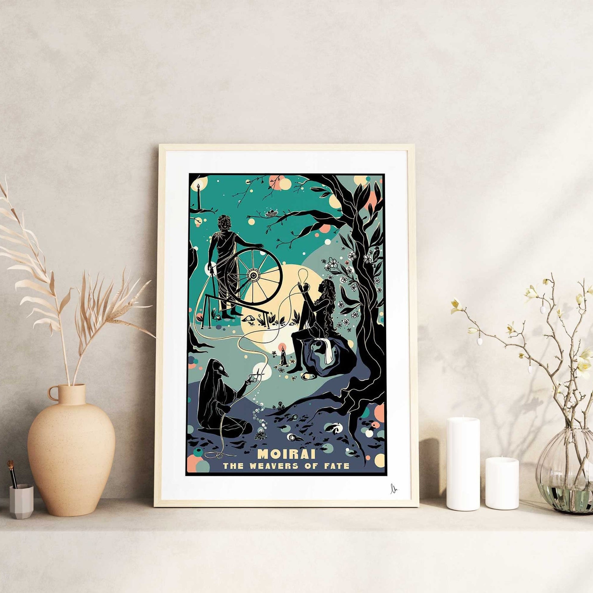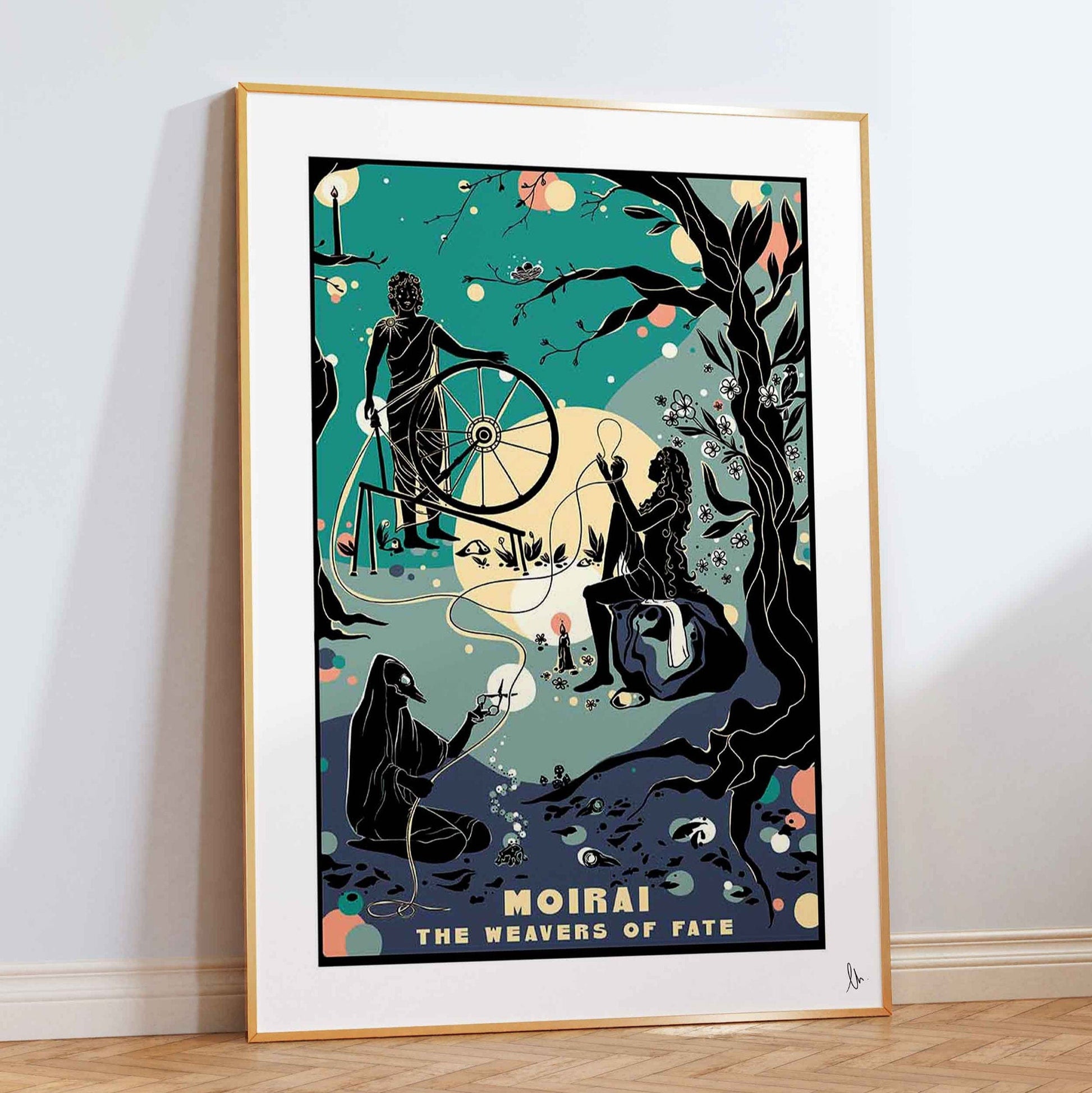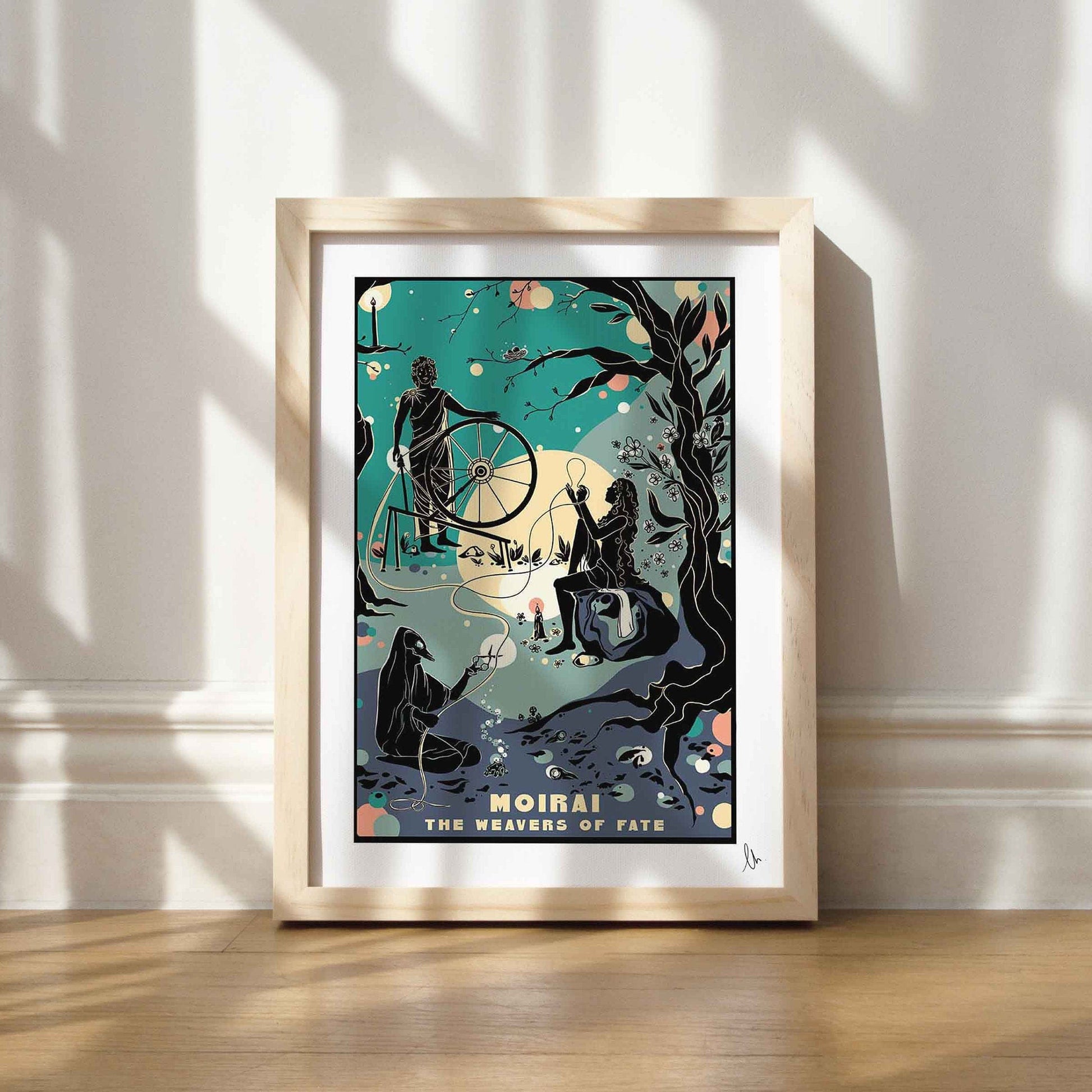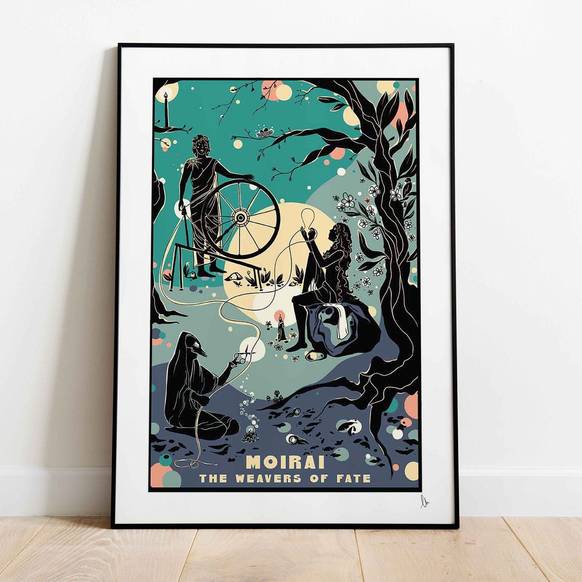 Moirai, The Weavers of Fate: this print celebrates the Ancient Greek sisters who personified destiny and the circle of life. The weaver starts the thread of life, the allotter measures out the length, and finally, the last sisters cuts it at its final end. This is the perfect gift for a fan of Greek folklore or just an excellent way for a Mythology Lover to add colour to their walls!