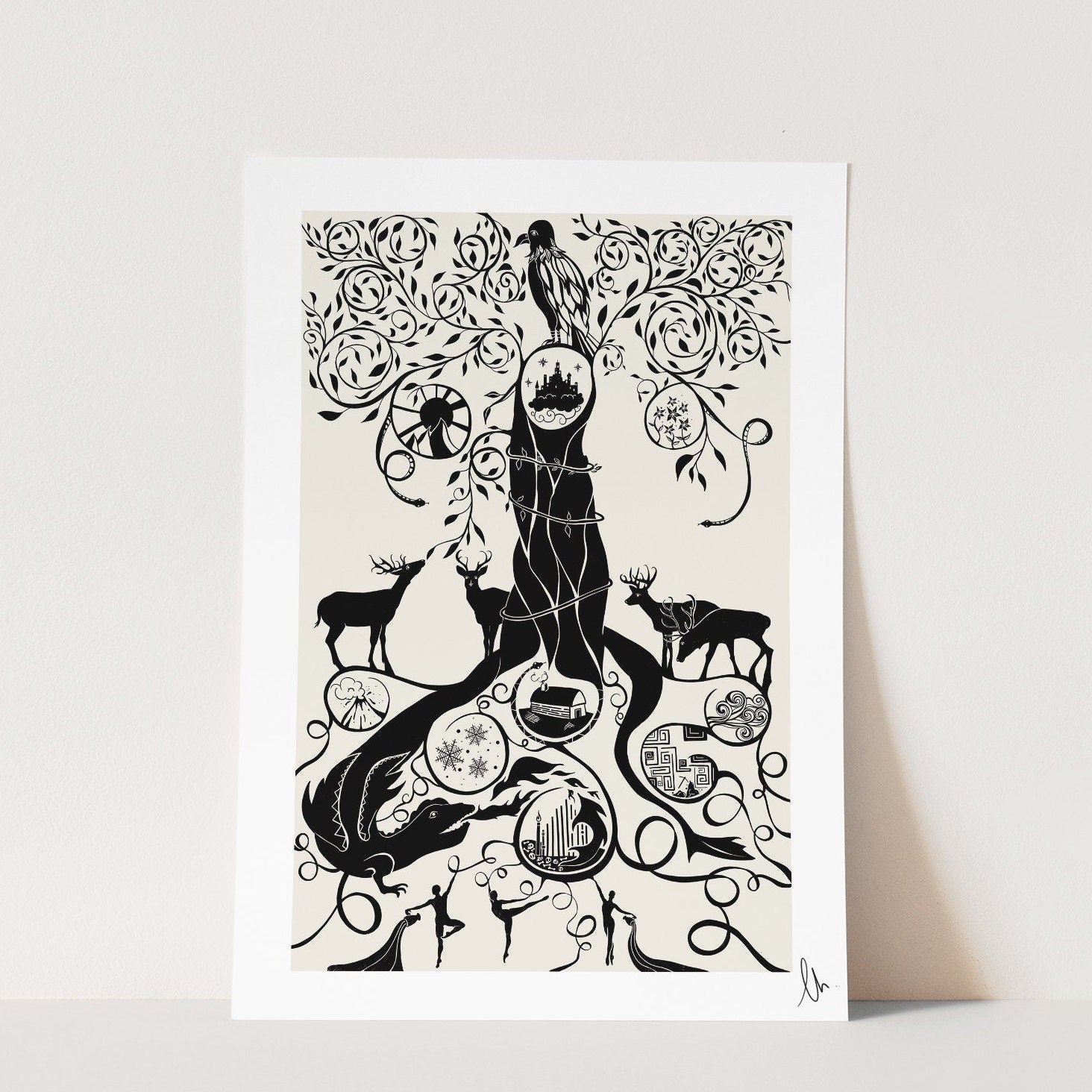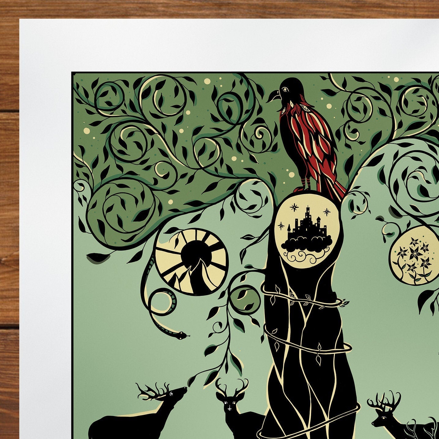 The Tree of Life and the centre of the universe holding the nine realms of Norse Mythology. The Yggdrasil is believed to be a huge ash tree holding places such as Asgard, Midgard, and Hel before being destroyed by Ragnarok. Perfect for fans of Norse mythology and fantasy landscapes, this minimal retro-style poster could liven up your study, or bedroom!